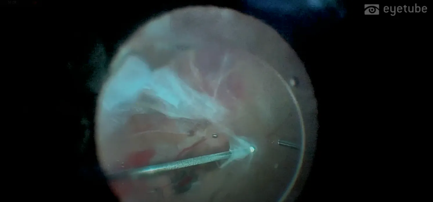 Additional findings included subretinal membranes and a partially adherent posterior hyaloid, consistent with a combined TRD/RRD. Thus, membrane dissection and posterior hyaloid removal were performed, and the subretinal membranes were extracted through strategically placed retinotomies.